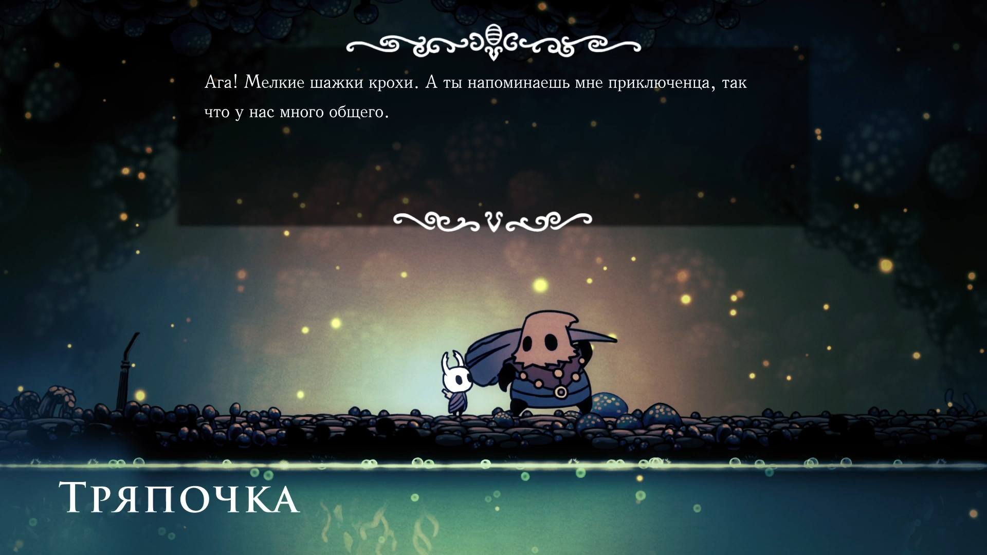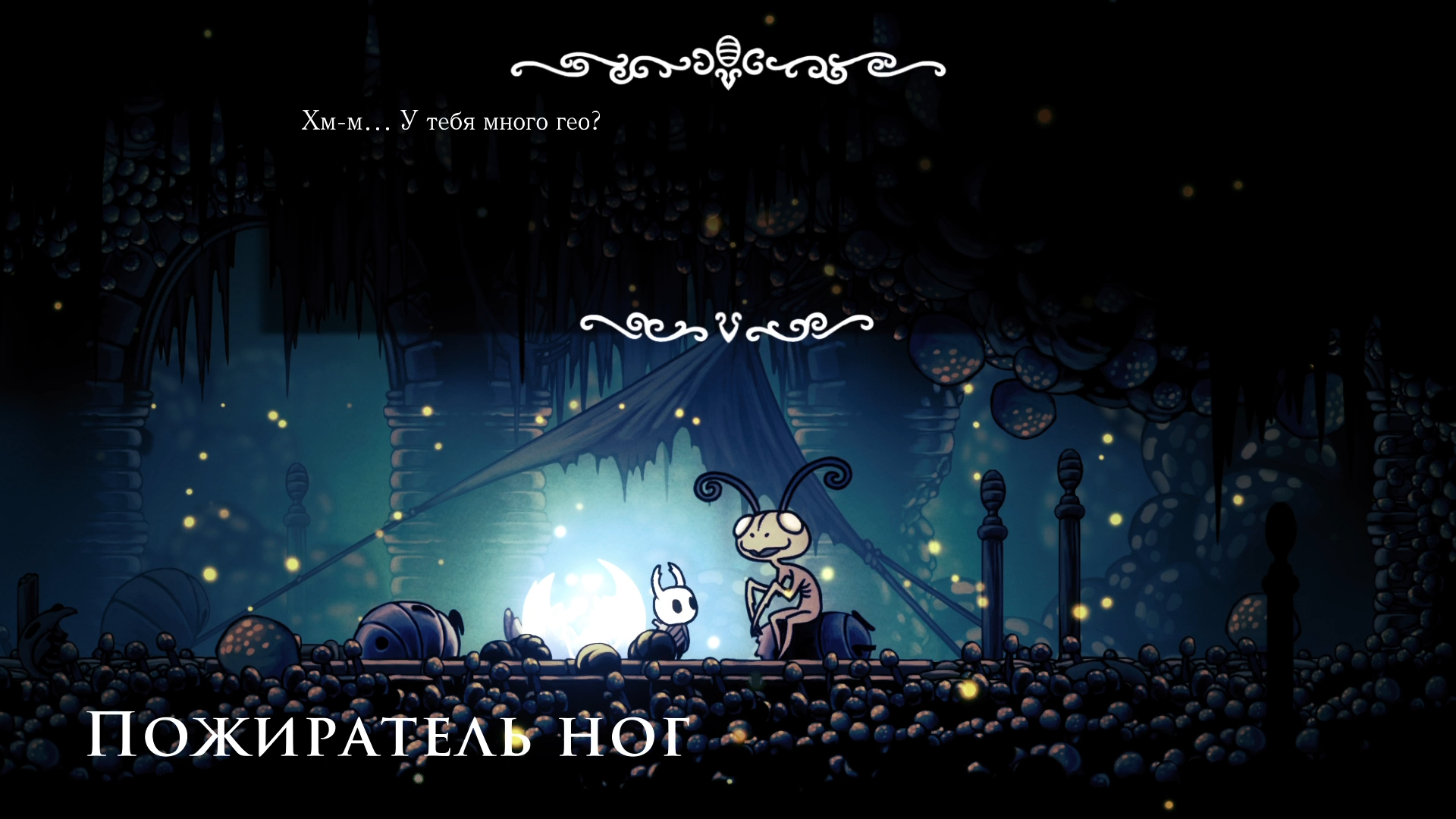 Дальше путь только вниз мимо множества ядовитых луж, разочек даже отъехал. Благо скамейка прямо рядом с Пожирателем. А вот следующая встреча меня напугала. Небольшая открытая площадка без врагов. Вдруг земля начинает трястись и из под земли выпрыгивает это чуда. Я был уверен на 112% что это начало босс-файта. Но нет, оказалось, что это дружелюбная и чудаковатая жучиха Тряпочка. Сказала мне, что поблизости находится деревня богомолов. Что ж, пойдем искать.