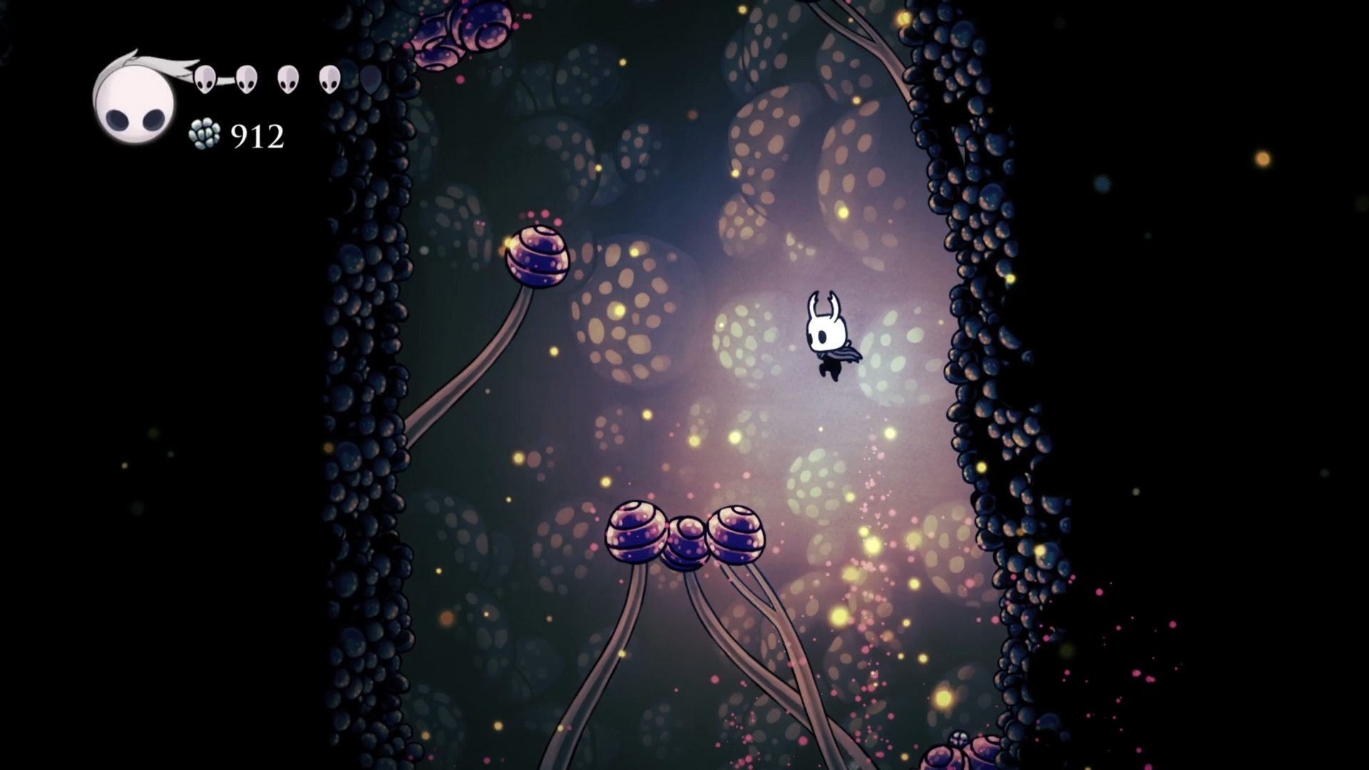 Пробираясь все дальше по грибным пустошам я наткнулся на новое для меня испытание - грибы батуты. Я еще не успел освоиться как следует с отскоком от поверхностей с помощью гвоздя, а тут меня еще и подбрасывает наверх при каждом отскоке. Некоторые грибки совсем маленькие, под многими из них обрыв или ядовитая жижа. В общем платформинг для меня это отдельный вид "удовольствия".