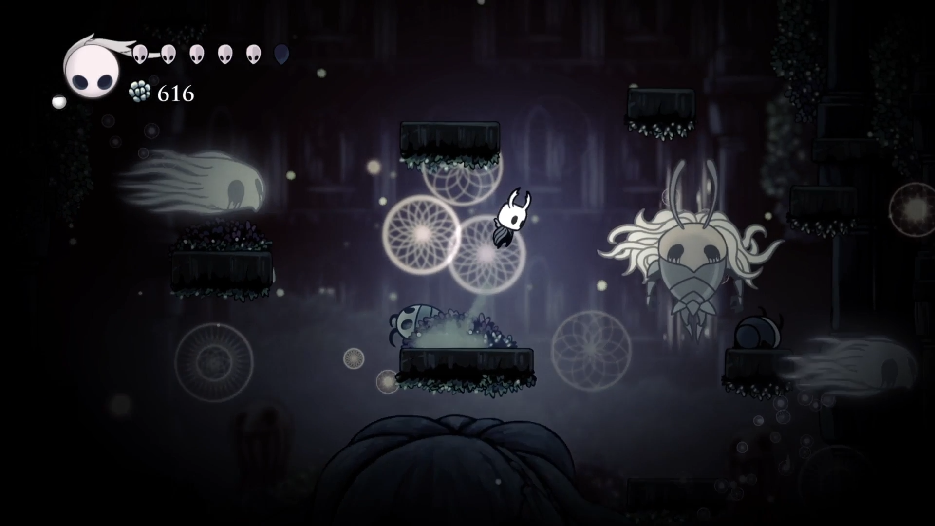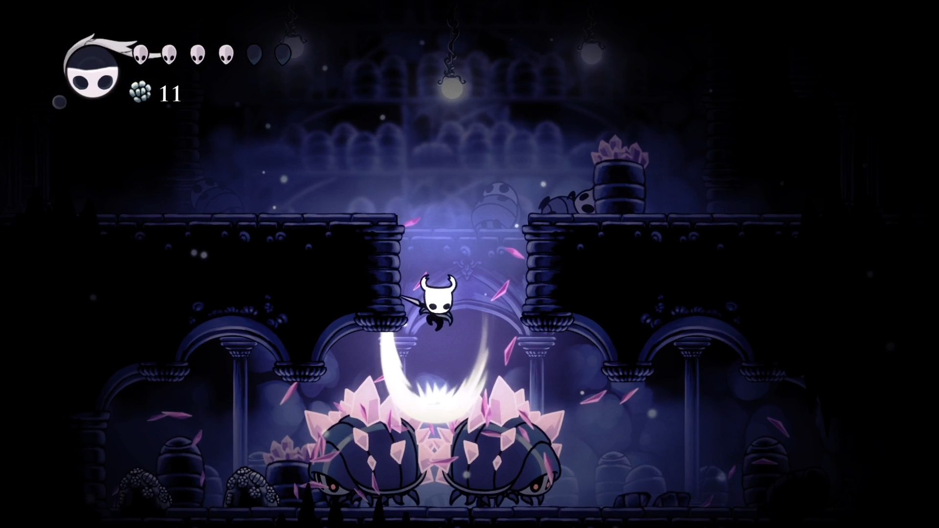 Кристальный Пик (именно так называется эта локация) встретил меня бронированными врагами и большой концентрацией платформинг секции. Враги очень неплохо разваливаются магией, но это здорово только когда есть запас духа. А когда его нет, приходится подгадывать тайминги чтобы бить в определенные уязвимые места. Вот этих жуков на скриншоте снизу можно бить только по морде, ото всех других мест гвоздь отскакивает как от шипов.